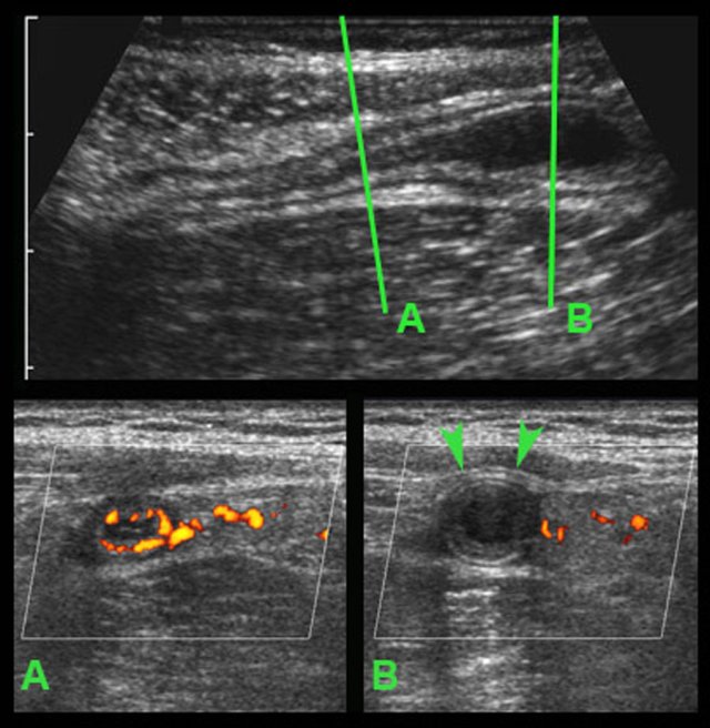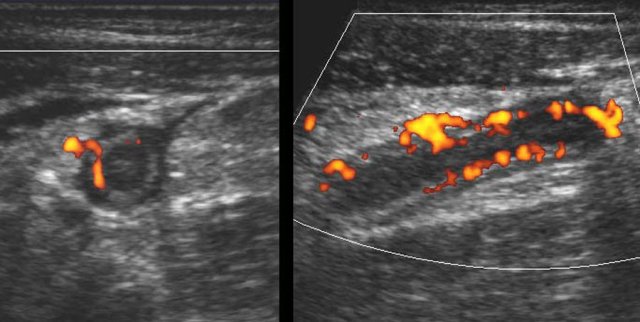 In plane A, Doppler US shows strong hypervascularization of the wall, however in plane B no vessels are visible in the appendix wall due to high intraluminal pressure.