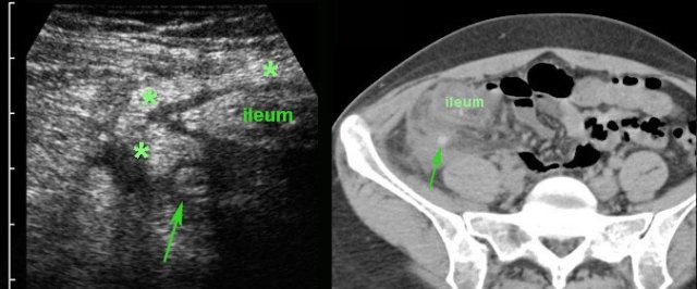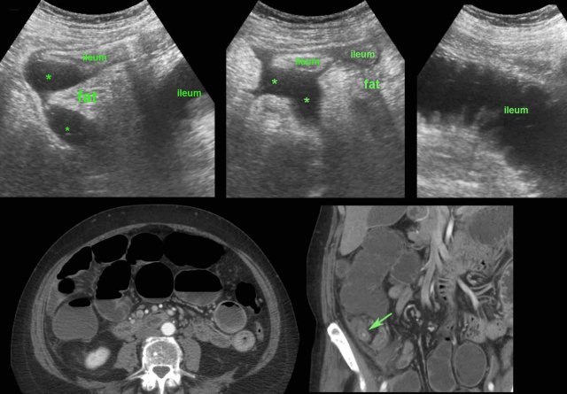 In this patient, US shows large quantities of inflamed fat (*) and the thickened ileum representing successful walling-off of the (imminent) perforation of the appendix (arrow).