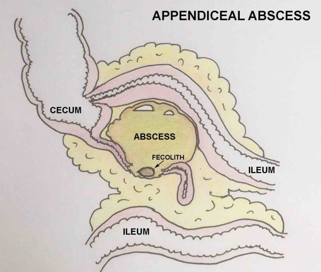 This patient had a large appendiceal abscess, walled-off by ileum and cecum.