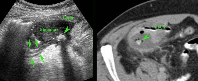 US showed an inflamed appendix (arrow) with an adjacent abscess, walled-off by inflamed fat and the terminal ileum.