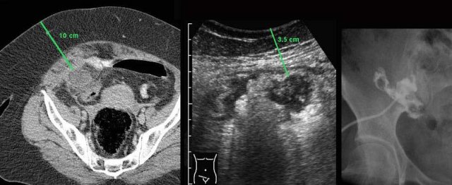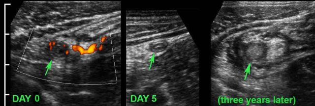 Three years later, she had recurrent symptoms and US showed acute appendicitis.