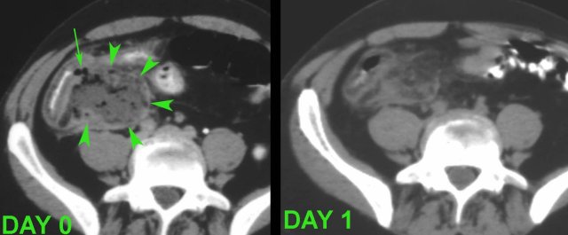 Finally, in patients with a small (< 2 cm) abscess (*) close to the appendix (arrows) who have only 3-4 days of symptoms, immediate appendectomy with removal of the small abscess is a good option.