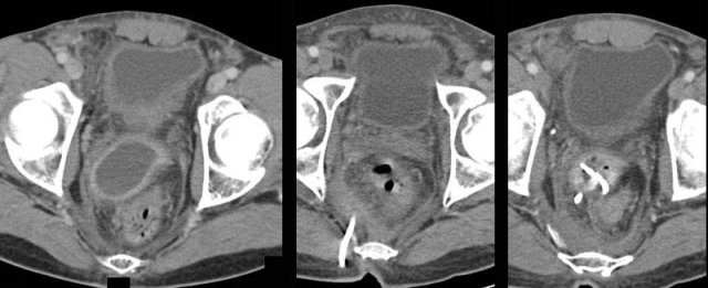 In this patient with a Douglas abscess the surgeon planned transrectal drainage on the OR, but was not able to locate the abscess.