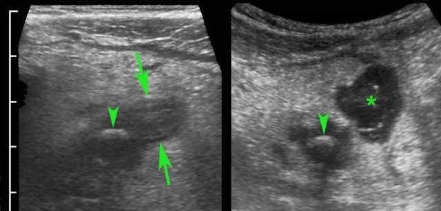 In this 56-year old lady with a CRP of 180, US revealed turbid intraperitoneal fluid (*) and possibly an inflamed appendix with fecoliths (arrows).