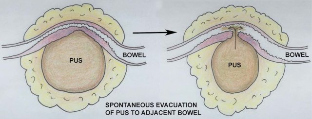 In stable patients who have no fever and only mild pain, it may be wise to await spontaneous drainage of the abscess to neighboring bowel.
