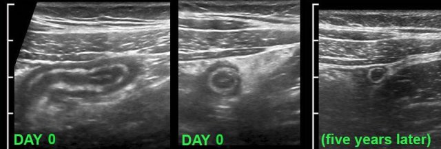 US was performed 5 years later for other reasons and demonstrated a normal appendix.
