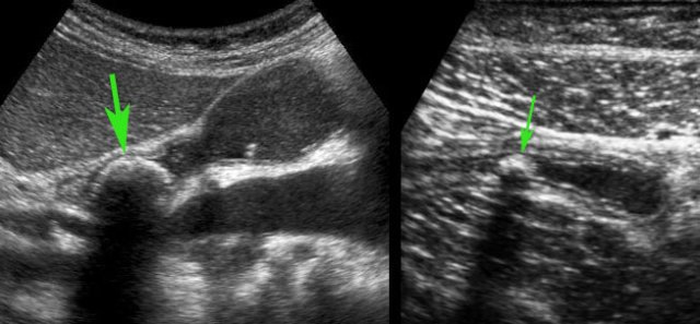 Once a gallbladder stone (large arrow) has been proven to obstruct the gallbladder neck or cystic duct, there is wide consensus that cholecystectomy ASAP is indicated.