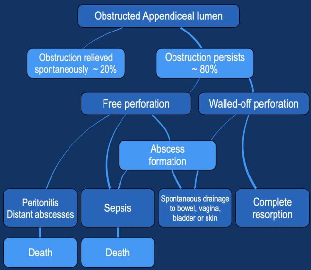 Depending on the inflammatory reaction of the human defense mechanism, the pathophysiological cascade of obstruction - high pressure - ischemic necrosis - bacterial attack with perforation, results in a clinical presentation.