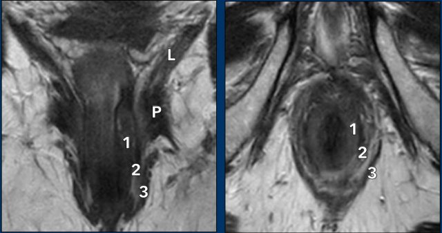 - The internal sphincter (1) typically has an intermediate to low signal intensity on T2W MRI.