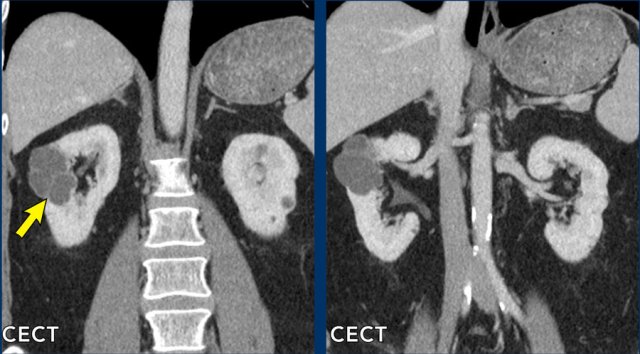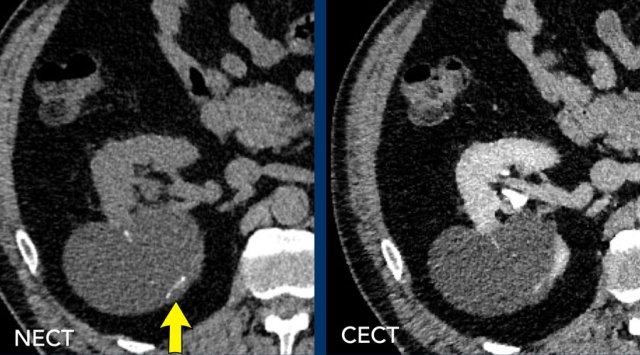 On contrast enhanced CT the adjacent enhancing renal parenchyma may increase measured density (pseudo enhancement) within benign cysts. Therefore, cystic masses measuring <30 HU in the portal venous phase are also considered benign.