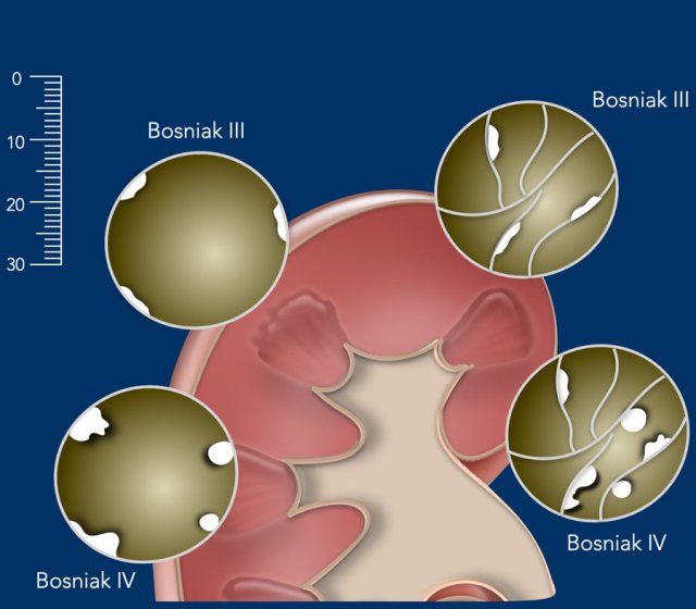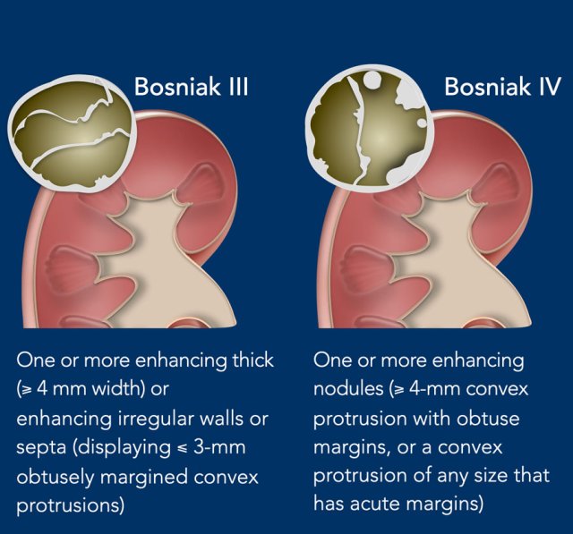 Bosniak III lesions are considered indeterminate with around half being malignant. Current practice regarding resection or observation varies between institutions and depends heavily on lesion size, patient comorbidities and surgeon preference.