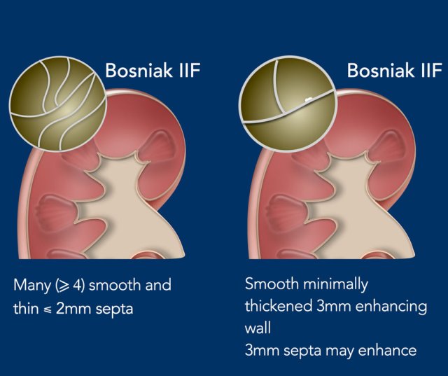 The incidence of malignancy in Bosniak IIF lesions is reported between 0-38% likely owing to differences in subjective grading of imaging features as well as strong selection bias whereby only the more worrisome lesions are resected. However, lesions in which there is progression of features from IIF to category III or IV have a high rate of malignancy of 85%, comparable to lesions initially characterised as Bosniak IV.