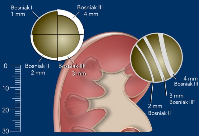 Bosniak I and Bosniak II masses that are characterized as benign may be described as “cysts” and the term “cystic renal mass” should be applied to Bosniak IIF, III and IV lesions.