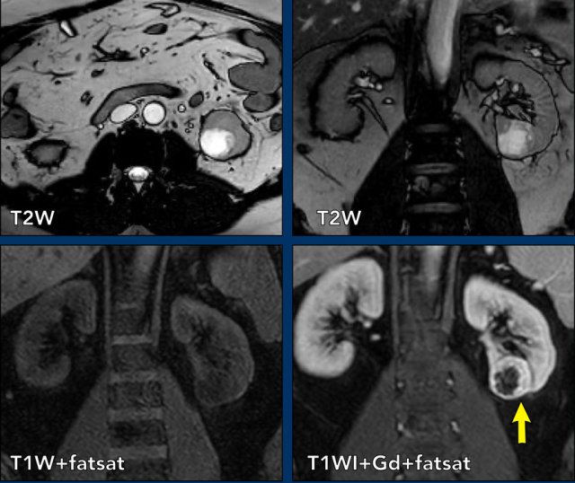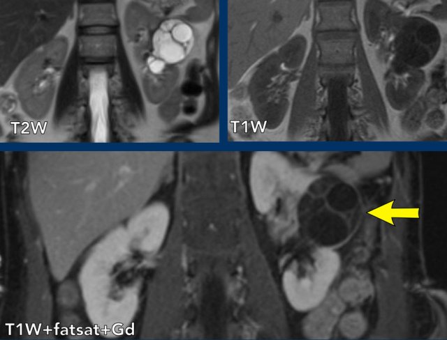 T2W coronal image of a cyst with many septa in the left kidney. On the T1W fatsat after contrast, these septa show obvious enhancement in comparison to the pre-contrast sequence.