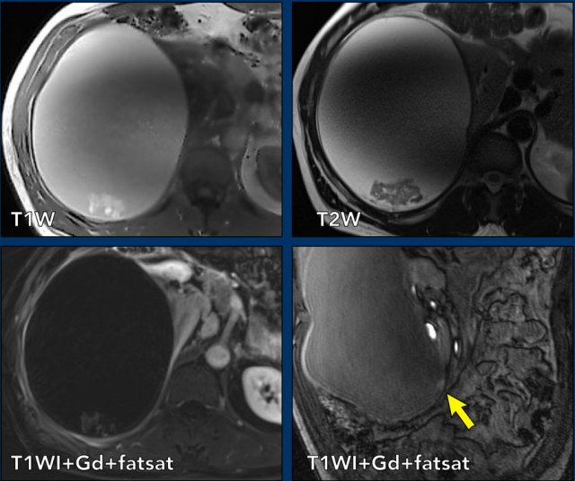 On the post contrast images there is no enhancement of the septa or wall but an enhancing mural nodule can clearly be identified (arrow).