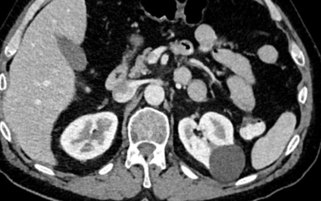 Well defined homogeneous masses seen on non-contrast CT measuring between -9 to 20 HU or >70 HU are highly likely to be benign cysts and can be ignored.