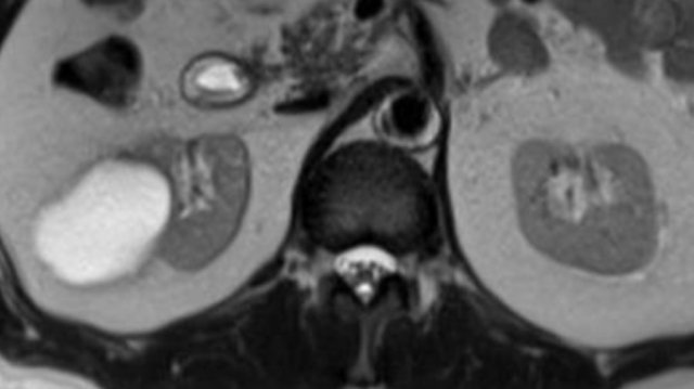 On the T2W-image a cyst with 3 smooth thin septa in the medial aspect of the right kidney (arrow).