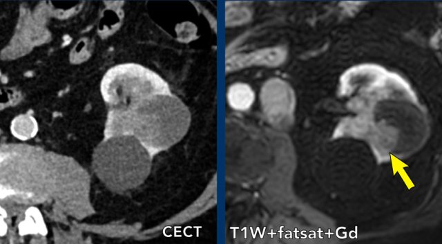 The hyperdense area shows enhancement on the T1W-image with fatsat, in keeping with a solid nodule in a Bosniak 4 cyst.