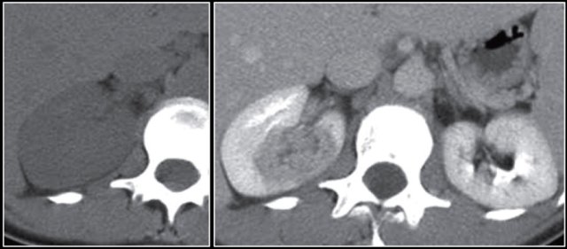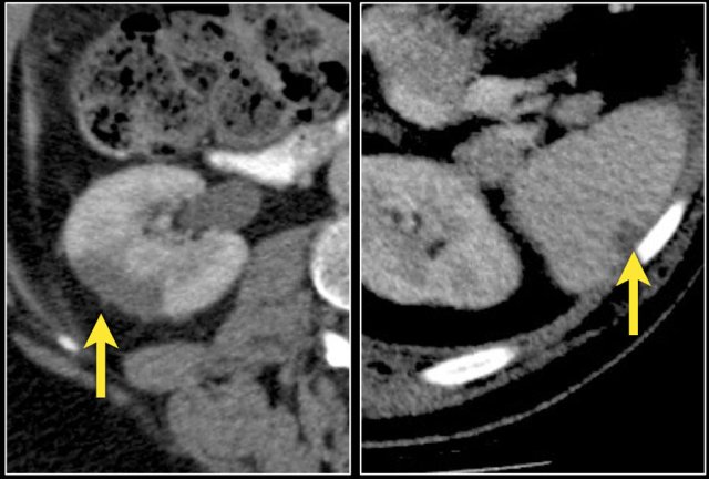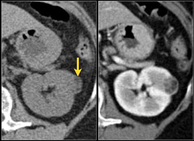 Infiltrative lesion in the upper pole of the right kidney, hardly visible on the unenhanced image on the left, clearly visible in the nephrogenic phase shown on the right. PA showed clearcell RCC