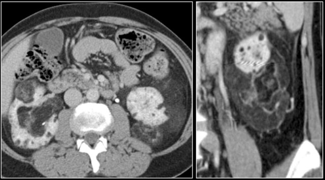 Cystic lesion with thick enhancing rim and infiltration of perirenal fat in a patient with a renal abscess