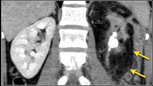 When the whole kidney is infarcted, the kidney will be enlarged and of low attenuation.