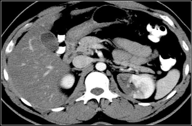 Infarction in right kidney and spleen in a patient with multiple systemic emboli.