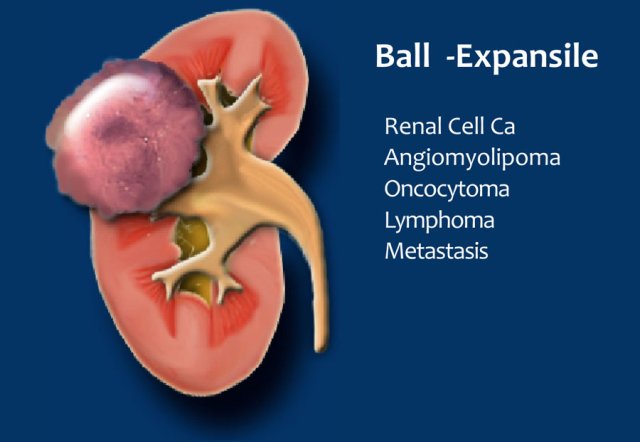 Renal cell carcinomas and oncocytomas are typical ball-type lesions.