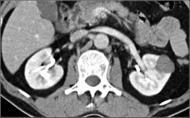 In the corticomedullary phase however it is clear that this is a pseudotumor.