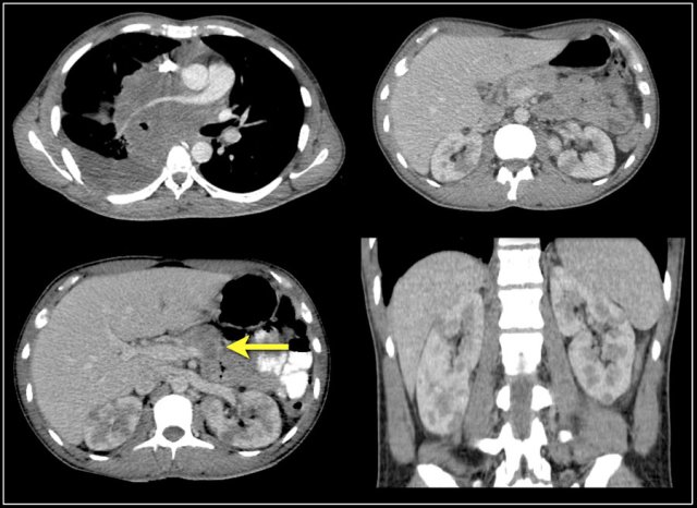 Here another patient with lymphoma located in the mediastinum, pancreas (arrow) and in both kidneys.
