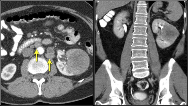 There is a metastasis in the left kidney and there are multiple lymph node metastases (arrows).