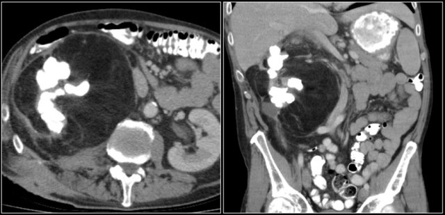 There is destruction of the right kidney, multiple calculi and surrounding fibrofatty proliferation.