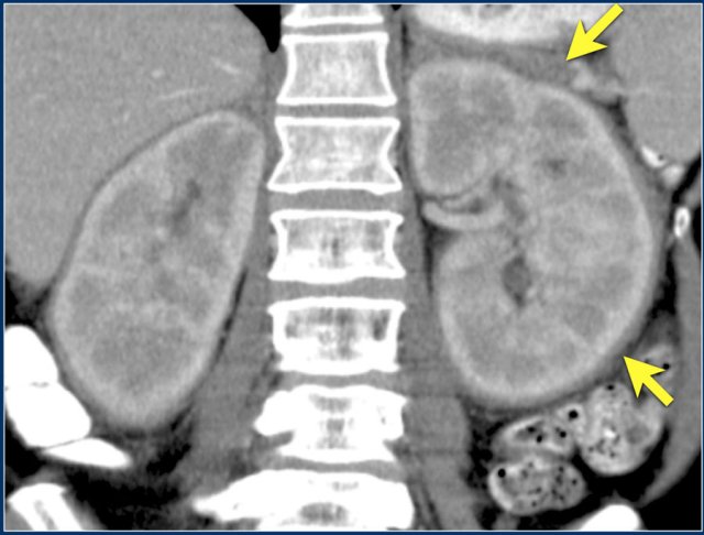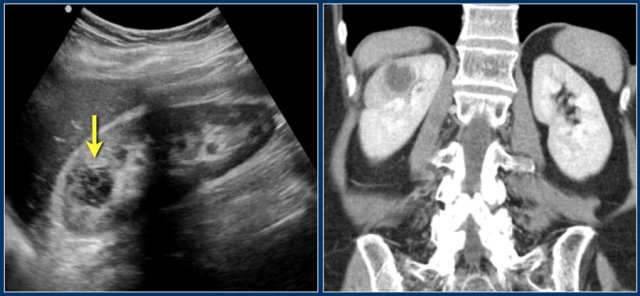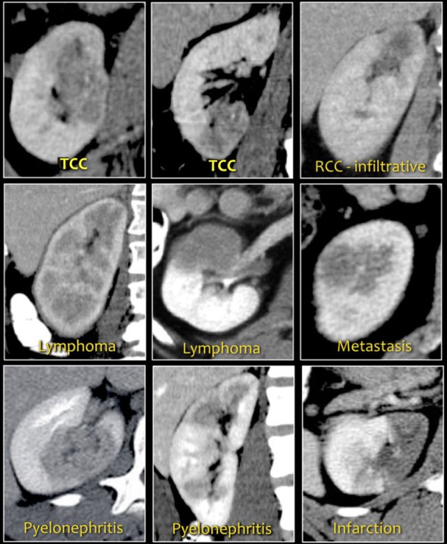 - Exclude metastatic disease and lymphoma; kidney localizations are usually only seen in widespread disease.