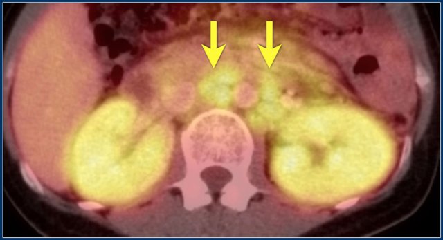 PET-CT shows diffuse renal involvement and also positive periaortic lymph nodes (arrows).