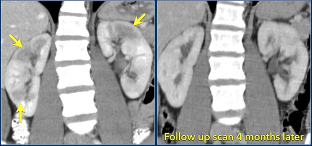 A CT scan 4 months later shows normal enhancement of both kidneys; the renal abnormalities on the first scan were therefore consistent with an episode of multifocal pyelonephritis.