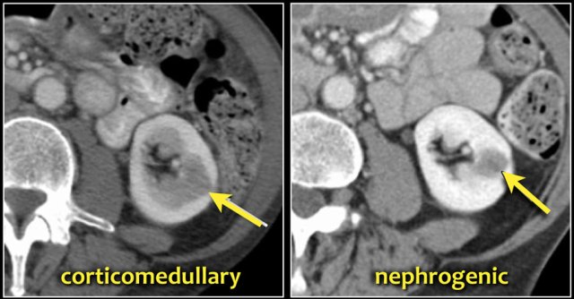 In the corticomedullary phase the normal corticomedullary pattern in these pseudotumors can be appreciated, distinguishing them from real lesions.