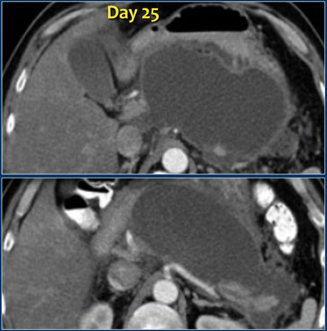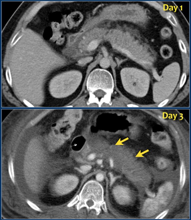 - On day 3 there is no enhancement of the pancreas, consistent with necrosis.