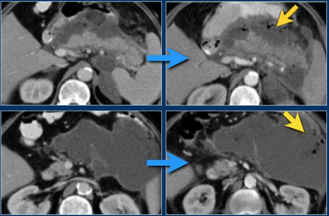 Two weeks later there are gas bubbles in the peripancreatic collection consistent with an infected acute necrotic collection.