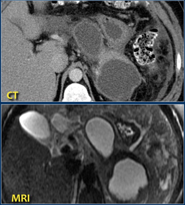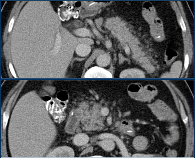 These images are of a patient who presented with acute severe epigastric pain very suggestive of acute pancreatitis.