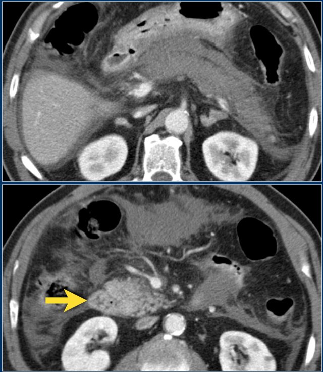 - Edema in the peripancreatic fat (yellow arrow), consistent with interstitial pancreatitis.