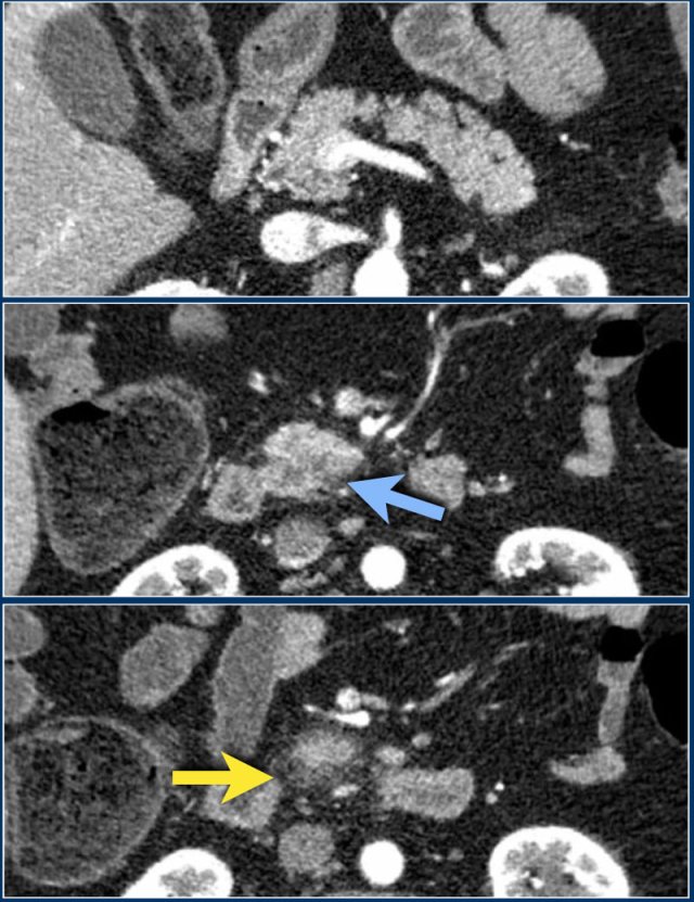 - Some edema of the uncinate process of the pancreatic head (blue arrow).
