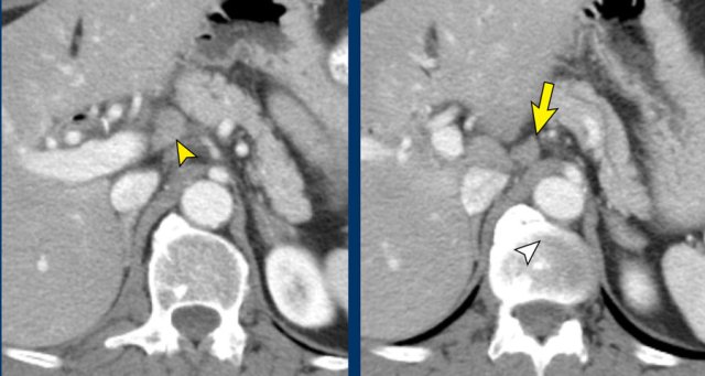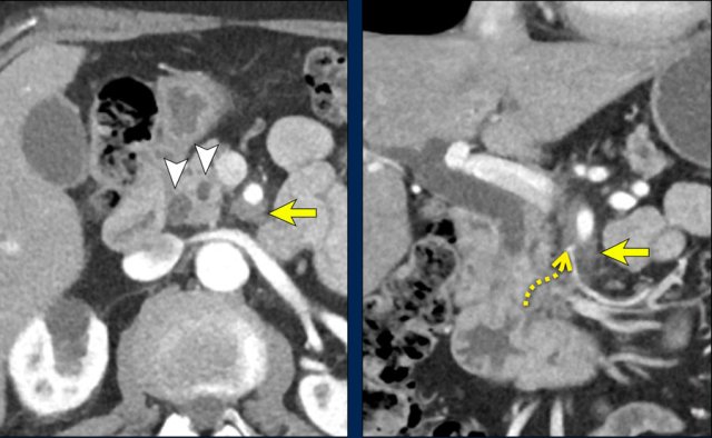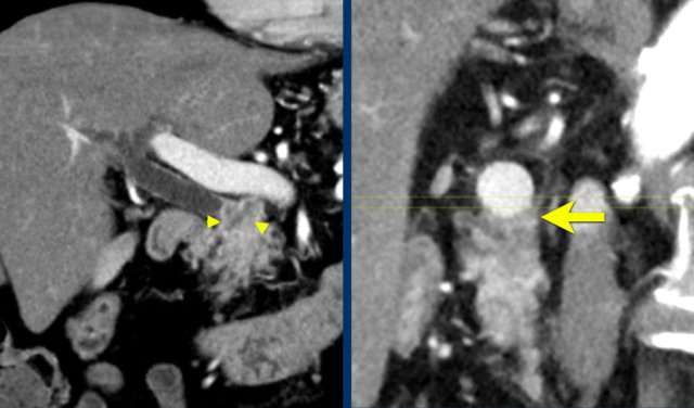 The axial CT shows a accessory right hepatic artery (yellow arrow) running in close proximity to a hypodense mass in the pancreatic head (arrowhead).