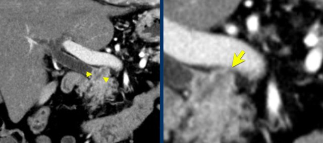 A coronal reformat shows a small tumor in the pancreatic head (arrowheads) with obstruction of the common bile duct.
