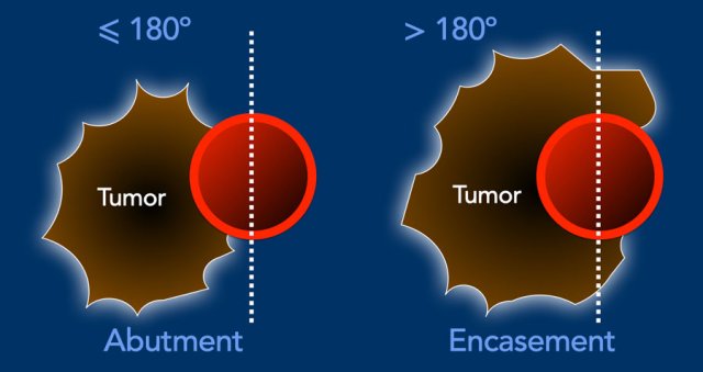 The probability of vascular invasion is 40% for abutment and 80% for encasement, up to 100% when the tumor is completely surrounding the portal vein or SMV.