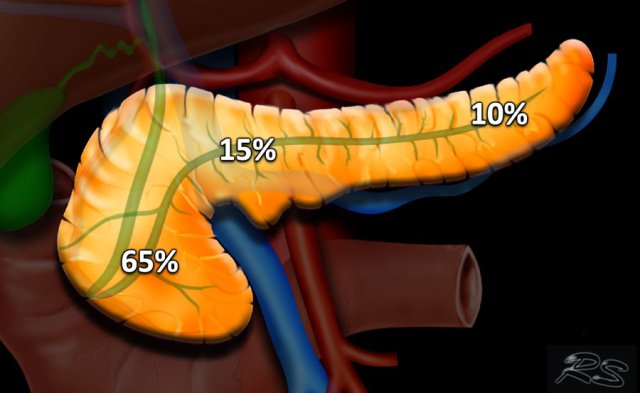 65% of pancreatic adenocarcinomas are located within the head, 15% in the corpus and 10% in the tail. The remaining 10% being multifocal or diffuse (figure).