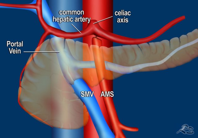 A significant stenosis of the celiac artery is usually overcome by collateral bloodflow from the SMA, via the peripancreatic arcade (of Buhler) and retrograde flow in the gastroduodenal artery. Since the gastroduodenal artery is resected during pancreaticoduodenectomy the arterial blood supply to the liver is at risk if a celiac artery stenosis is not detected preoperatively.
