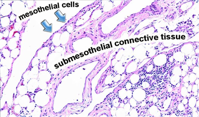 The peritoneum is a serosal membrane, which is composed of a single layer of flat mesothelial cells supported by submesothelial connective tissue.
