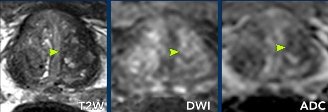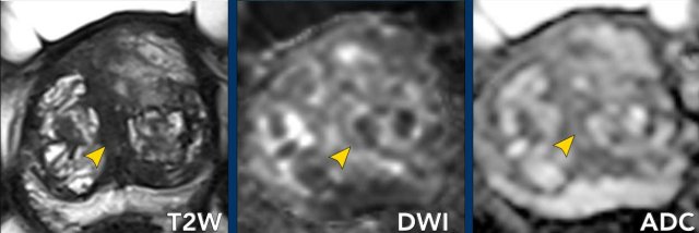 T2W and ADC and high signal intensity on DWI (black arrow).