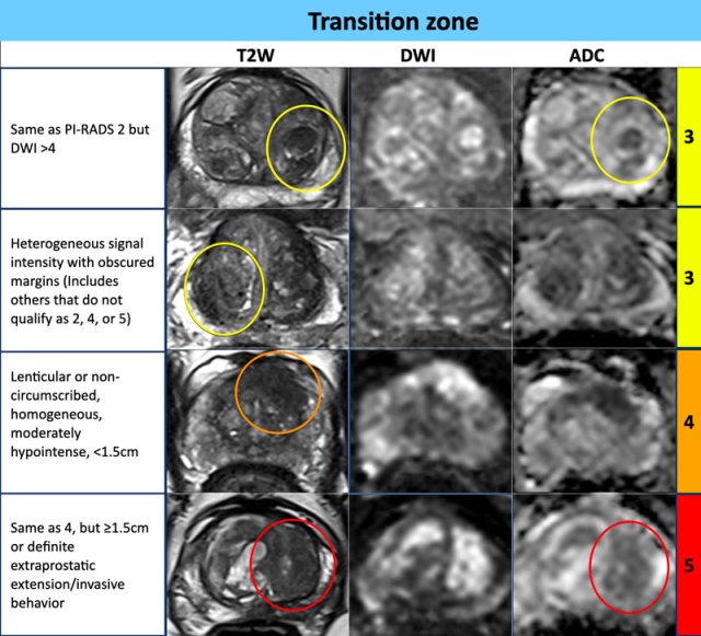 - Lesions in the transition zone with a T2W score 2 remain a PI-RADS score 2 score if the DWI/ADC score is ≤ 3, however, they become a PI-RADS score 3 score if the DWI/ADC score is ≥ 4.
