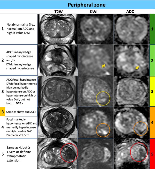 For the peripheral zone the DWI/ADC is the primary determining sequence to assign the PI-RADS assessment category.