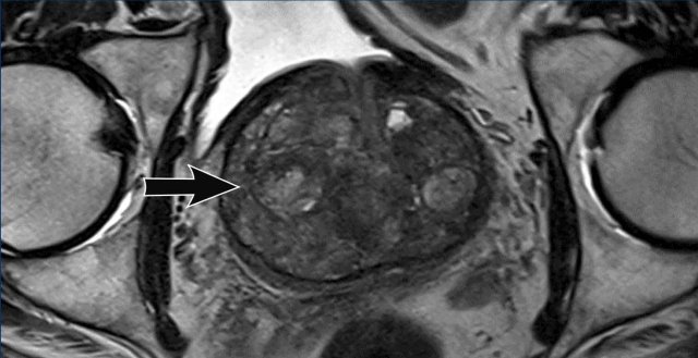This lesion showed a Gleason score 4+3 following MRI-targeted biopsy.